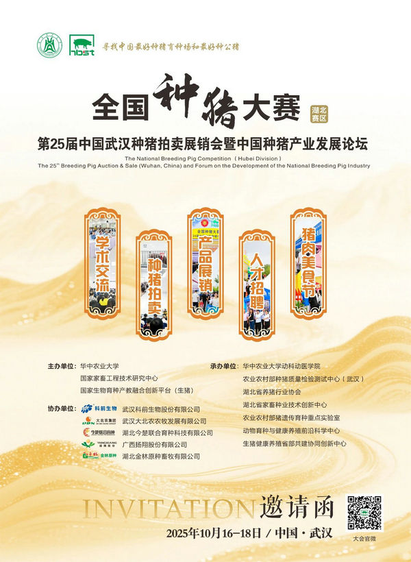 全國種豬大賽(湖北賽區)暨第25屆中國武漢種豬拍賣展銷會與中國種豬產業發展論壇,定于2025年10月16—18日在華中農業大學國家種豬測定站召開,由福建傲農生物科技集團股份有限公司、廣東中芯種業科技有限公司、廣西揚翔股份有限公司、鄂州祥騰牧業有限公司、湖北今楚聯合育種科技有限公司、湖北金林原種畜牧有限公司、湖北金旭爵士種畜有限公司、湖北三湖畜牧有限公司、湖北省農業科學院畜牧獸醫研究所、武漢市江夏區金龍畜牧有限責任公司、金新農?武漢天種畜牧有限責任公司、武漢中糧肉食品有限公司、武漢諸樂田源生態農業有限公司、浠水長流牧業有限公司、湖南天心種業常德原種場、四川德康農牧食品集團股份有限公司、四川新希望六和豬育種科技有限公司、陜西省安康市秦陽晨原種豬有限公司送測的288頭優秀種豬參加本屆種豬大賽,同臺競技,特優級種豬將公開拍賣。
